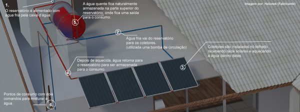 1 – Sistema Acoplado: É um sistema mais compacto, voltado a atender 1 a 2 pessoas. Contém um reservatório térmico pequeno e um coletor, e uma caixa de água pequena acoplada para quebrar a pressão da água da rua.
